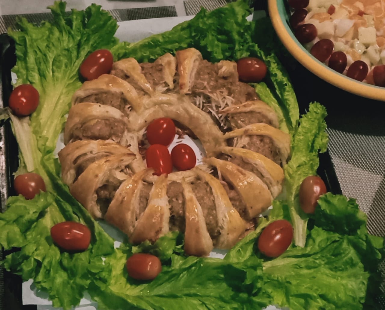 Pastry yang membungkus daging dan telur serta taburan keju yang sangat lezat. Dilengkapi selada dan tomat cherry cocok sekali acara kumpul-kumpul bersama keluarga